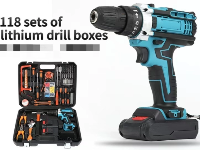 The kit includes a 21V cordless lithium drill with a 10mm keyless chuck, providing efficient performance for drilling and fastening tasks. Accompanied by 118 accessories, it caters to a wide range of applications, making it a suitable choice for drill machine suppliers and power tool manufacturers.